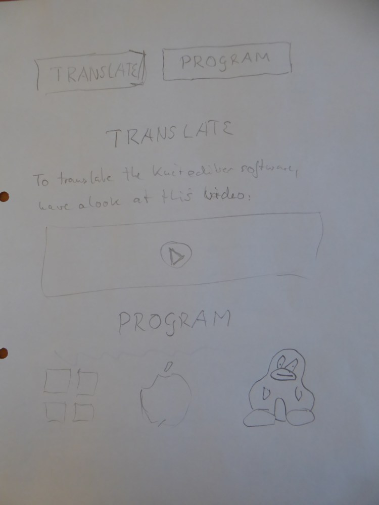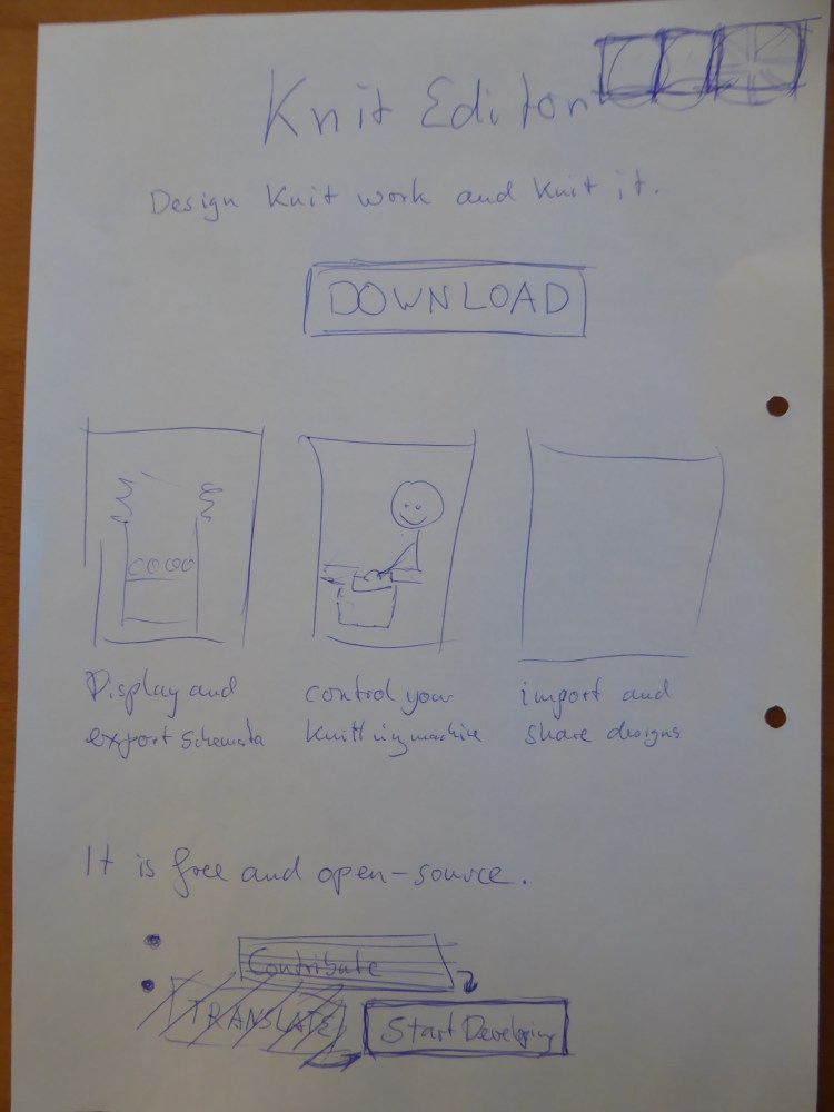 The Knit Editor software aims to be installable and usable by end-users. In the whole summer of code, we focused on development and code documentation from the perspective of a developer. In this blog post we will discuss how the Knit Editor is presented to the end user. So, you reading this blog: Please comment with your thoughts on the sketches.